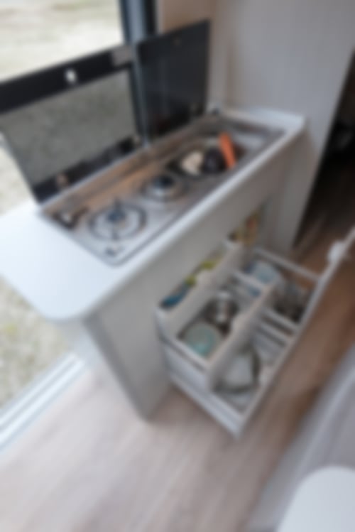 Die Küchenzeile ist mit 2-Flammen-Premiumkochfeld, elektronischer Piezozündung und hochwertigen Glasabdeckungen ausgestattet. Um die Arbeitsfläche mit noch mehr Ablagemöglichkeiten zu nutzen, ist auch hier eine tolle Erweiterung von 40cm im Serienumfang enthalten. Damit die Abfalltasche unsichtbar verstaut werden kann, befindet sich im Küchenblock eine gut zugängliche Verstauungsmöglichkeit. Besonderes Highlight ist der 140l Twin-Tower Premium Kompressorkühlschrank mit gekühlter Getränkeschublade. Die Küchenzeile hat drei Schubladen mit Vollauszug und Softclose-Mechanismus. Alle Küchenutensilien sind bestmöglich über den Zusatzschrank mit Auszug (ähnlich Apothekerschrank) zu erreichen.